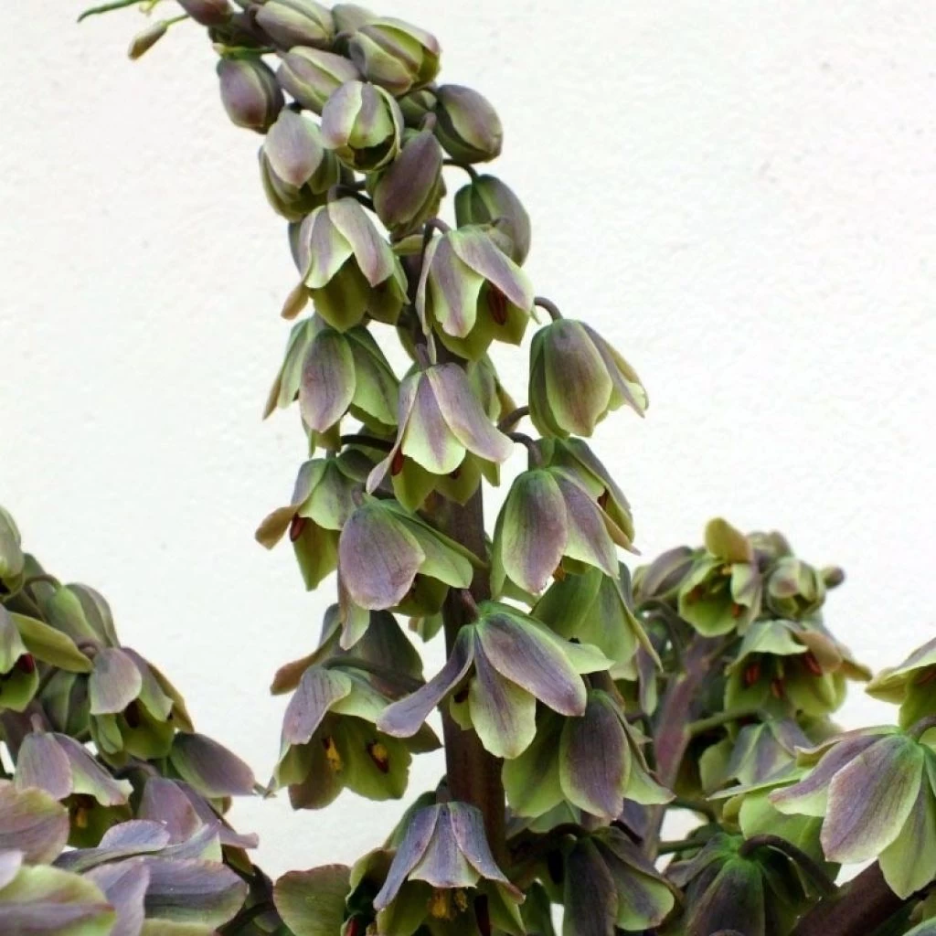 ‘Green Dreams’ se développe à partir d’un gros bulbe écailleux mesurant jusqu’à 8 cm de diamètre qui redoute l’humidité hivernale. Les bourgeons émergent vigoureusement du sol en février-mars, puis s’allongent rapidement pour former des hautes tiges atteignant au moment de la floraison, en avril, 80 cm de hauteur. Chaque tige est garnie jusqu’à une hauteur de 50 cm de feuilles entières et courtement lancéolées, régulièrement étagées et implantées en spirale. Elles arborent un très beau coloris gris-vert-bleuté mat. Chaque tige se termine en épi de plus de 30 cm de long, portant 15 à 20 grosses fleurs en clochettes retombantes serrées les unes contre les autres. Leur teinte bicolore, vert et prune à l’éclosion, s’éclaircit un peu au plein épanouissement. Les pétales semblent couverts, tout comme les feuilles, d’une légère pruine argentée. Leur parfum, agréable, attire les insectes pollinisateurs. Après pollinisation se forme un fruit cylindrique et dressé qui libèrera à maturité de nombreuses graines plates. La végétation aérienne de la fritillaire de Perse Green Dreams disparaît en été, la plante entre en repos. À cette période de l’année, le sol devra être plutôt sec.