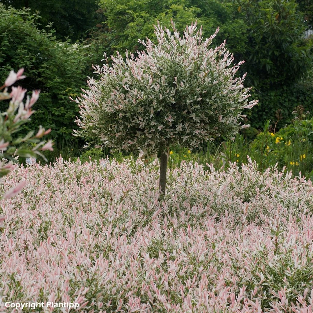 Comme un grand nombre d’arbustes panachés, le Saule crevette préfère les expositions tamisées, surtout en climat chaud, lorsque l’air est sec. Évitez-lui dans ce cas une exposition trop ensoleillée au risque de voir son feuillage brûler. Il se plaira en lisière de bosquet, ou bien à exposition est ou ouest. Son développement modeste convient bien aux petits espaces où il peut être planté en sujet isolé, au centre d’un massif de vivaces ou d’arbustes. Il peut également être cultivé dans un grand pot, en ayant soin de choisir celui-ci d’une teinte assez neutre pour ne pas interférer avec le festival de couleur de ce saule ! On l’associera volontiers à des arbustes à feuillage vert sombre pour la même raison, comme des Camélias dont les feuilles persistantes lustrées trancheront sans excès avec la finesse des feuilles bariolées de notre saule ‘Flamingo’. La sobriété d’un Hydrangea aspera Macrophylla, au feuillage vert foncé velu, tempérera en toute harmonie l’exubérance de ce saule crevette.